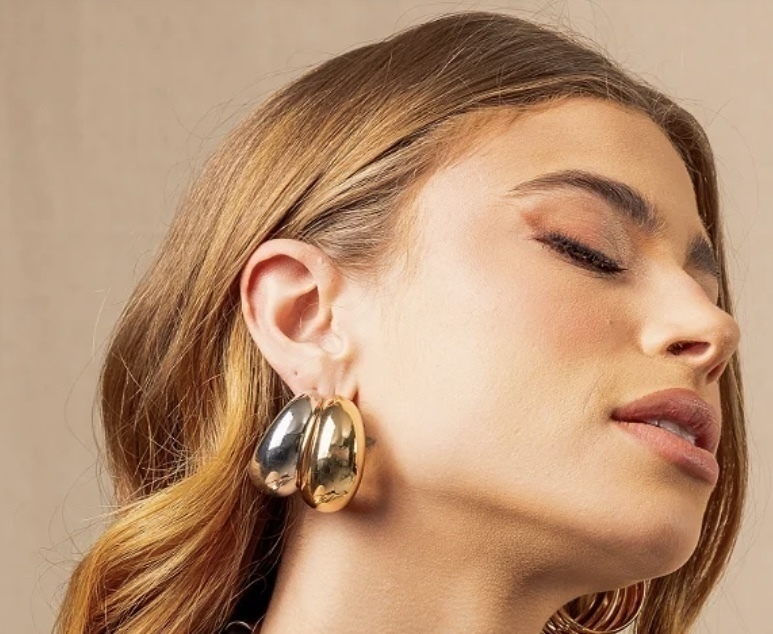 Argola em metal com formato de lua. Pino e tarraxas. Disponível no banho 18k e ródio.